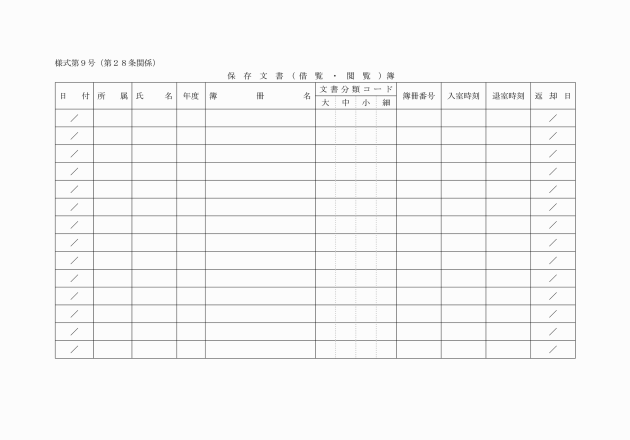第28条 執務のため保存文書の借覧又は閲覧をしようとするときは、総務課に備付けの保存文書(借覧・閲覧)簿(様式第9号)に必要事項を記入しなければならない。