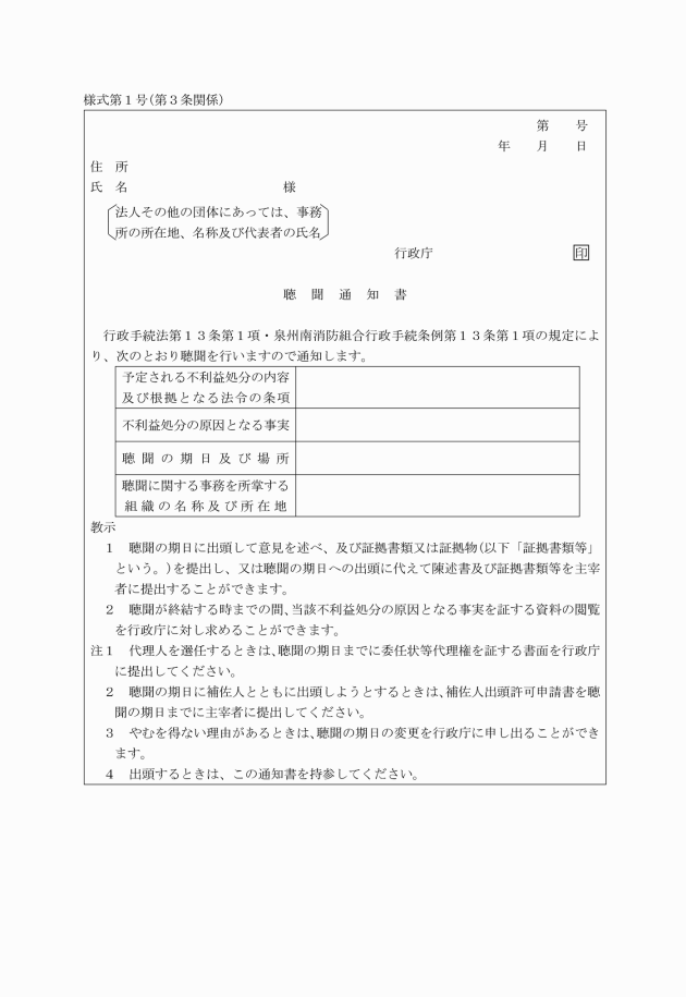 第1条 この規則は、行政手続法(平成5年法律第88号。以下「法」という。)又は泉州南消防組合行政手続条例(平成24年泉州南消防組合条例第22号。以下「条例」という。)に定めるもののほか、聴聞及び弁明の機会の付与の手続に関し必要な事項を定めるものとする。