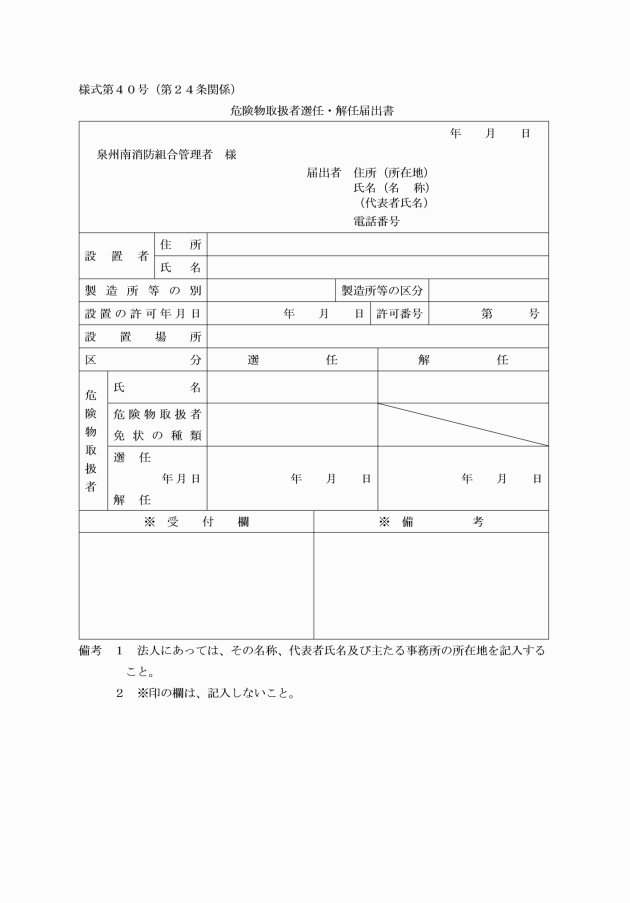 第24条 製造所等の所有者、管理者又は占有者は、次の各号のいずれかに該当する場合においては、遅滞なく当該各号に掲げる様式による届出書により管理者に届け出なければならない。