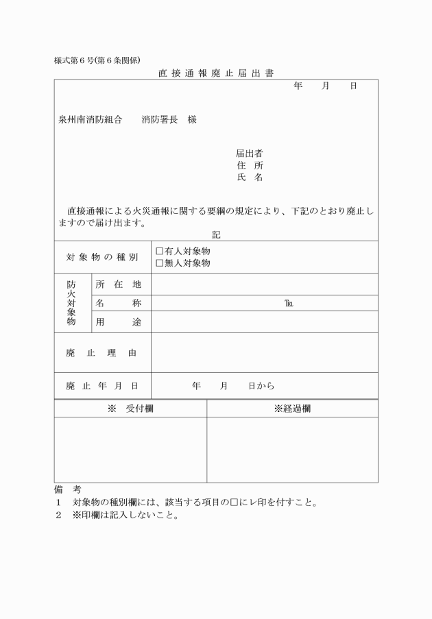 2 直接通報の取扱いを中止しようとする場合は、速やかに直接通報廃止届出書(様式第6号)により消防署長に届けなければならない。