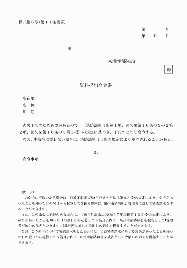 第14条 第11条の資料提出命令書及び第12条の報告徴収書の交付については、泉州南消防組合違反処理規程(平成30年泉州南消防組合消防長訓令第9号。)第28条の規定を準用する。