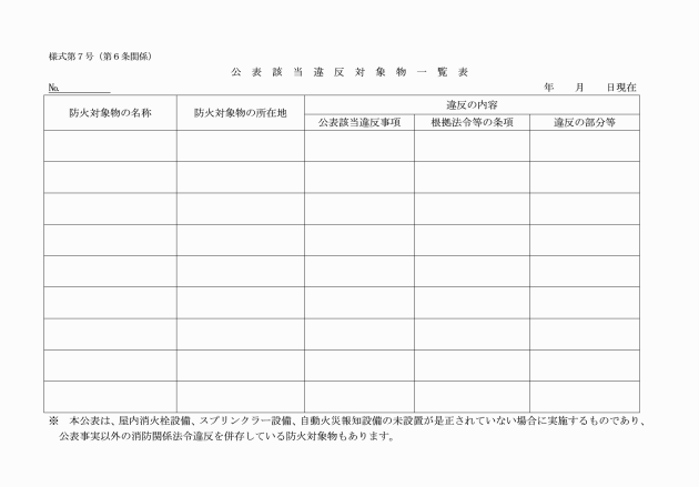 (7) 消防長は、公表予定日において公表該当違反が認められる場合は、違反対象物一覧表(様式第7号)により条例規則第14条第2項に定める事項を公表するものとする。ただし、前号の規定による報告を受けた場合はこの限りでない。