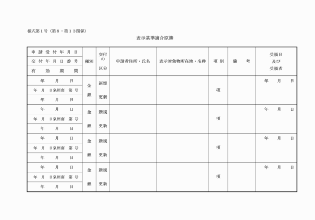 (3) 表示基準適合原簿(様式第1号)の備考欄に「対象外施設」と記入するとともに、その他必要事項を記入する。