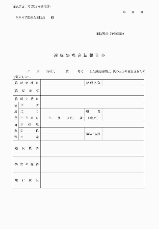 4 告発に係る証拠物件として資料の提出を命じ、又は報告を求め、若しくは収去するときは、泉州南消防組合査察規程(令和3年泉州南消防組合消防長訓令第15号)第18条に規定する資料提出命令書又は報告徴収書若しくは泉州南消防組合危険物規制規則(平成25年泉州南消防組合規則第22号)第27条に規定する収去書を作成し、保存しておくものとする。